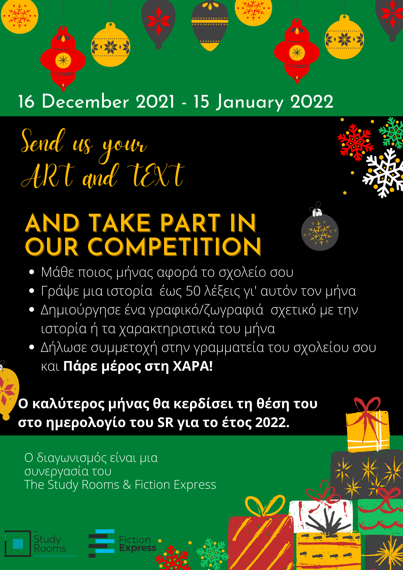 To Study Rooms διοργανώνει για τους μαθητές-χρήστες του προγράμματος Fiction Express κατά το σχολικό έτος 2021-2022 το project “Christmas Competition”. Στόχος μας είναι να προωθήσουμε τη δημιουργικότητα και την έμπνευση των παιδιών . Γιατί τη δημιουργικότητα μπορούμε όλοι να την αισθανθούμε και να τη διδαχτούμε στο σωστό περιβάλλον και με την κατάλληλη καθοδήγηση.